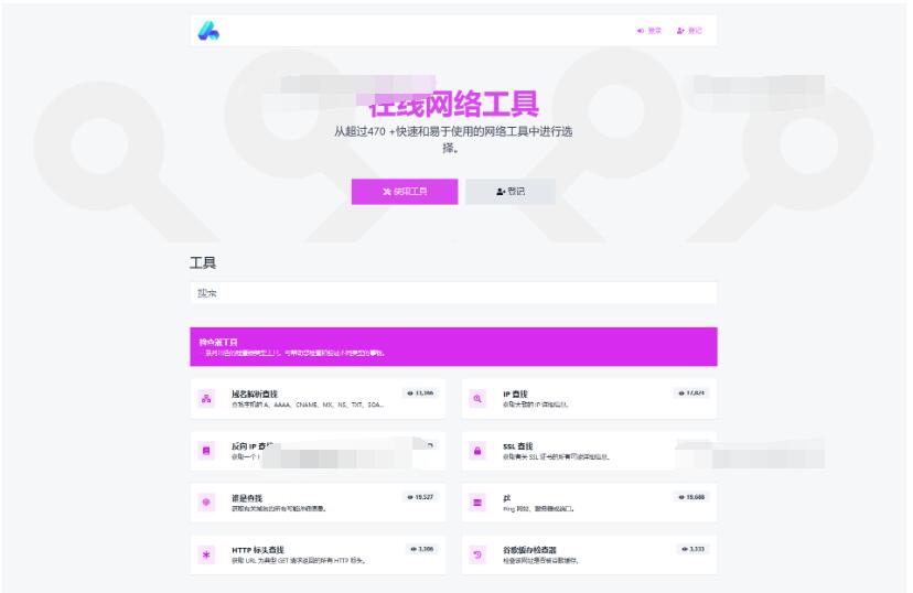 DNS 查找工具。IP 查找工具。SSL 查找工具。Whois 查询工具。Ping工具。MD5 生成器工具。Base64 转换工具。Base64 图像转换工具。